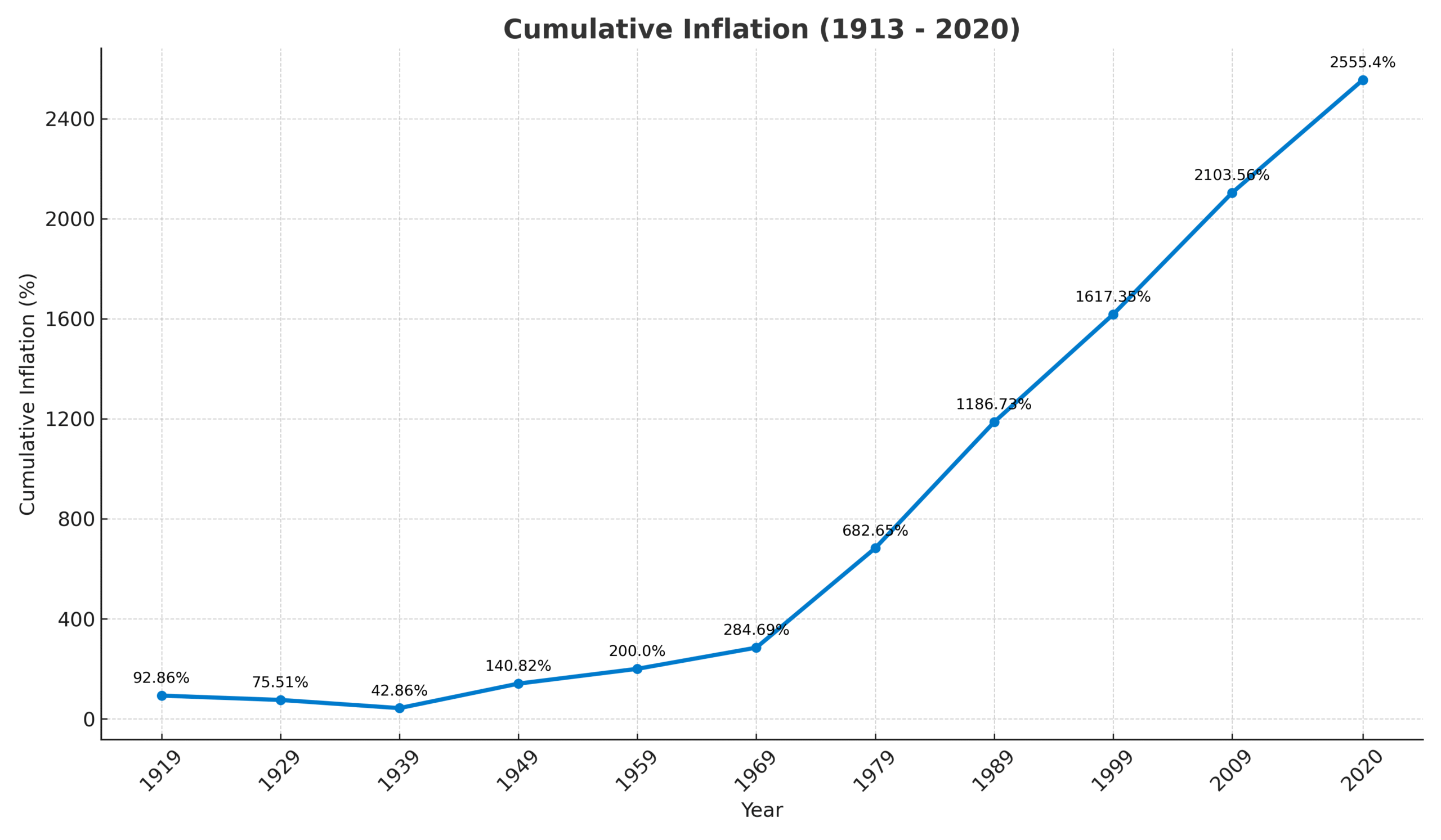 The chart below shows the average annual inflation rate for each decade since 1913. The average annual inflation rate since 1913 is 3.10%. This rate of inflation has resulted in prices increasing by 2555% since 1913. This means that something that cost $100 in 1913 would cost $2,555.